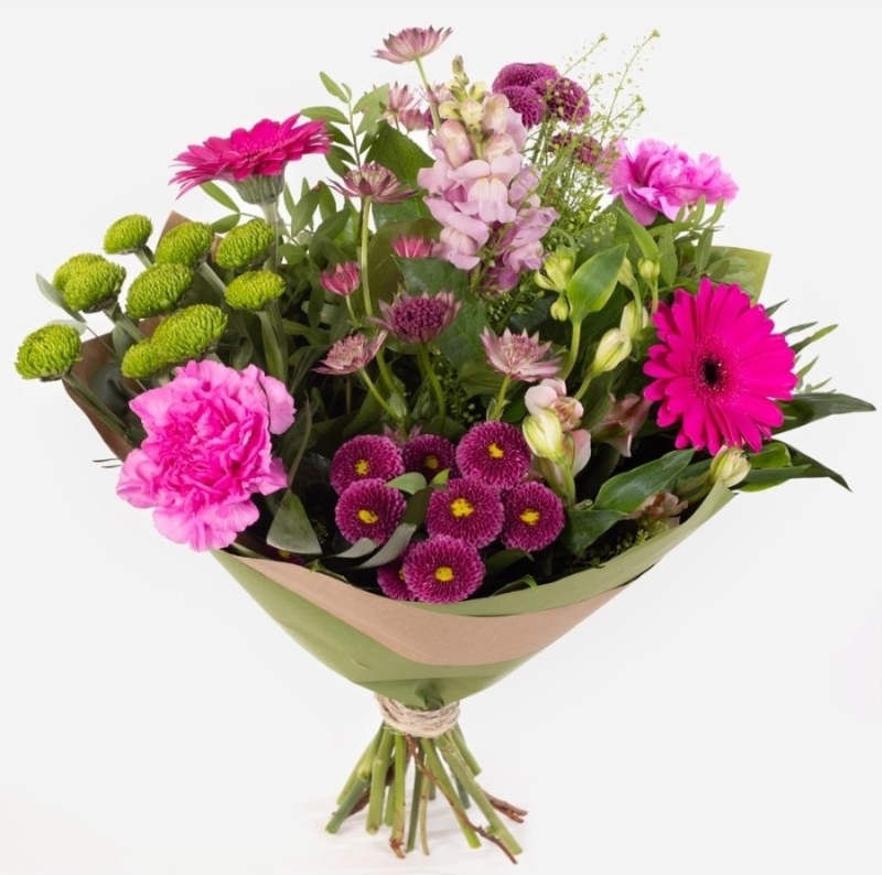 With its mix of vibrant pink and purple tones complemented by fresh greenery, this bouquet is perfect for marking special occasions or simply adding joy to everyday moments