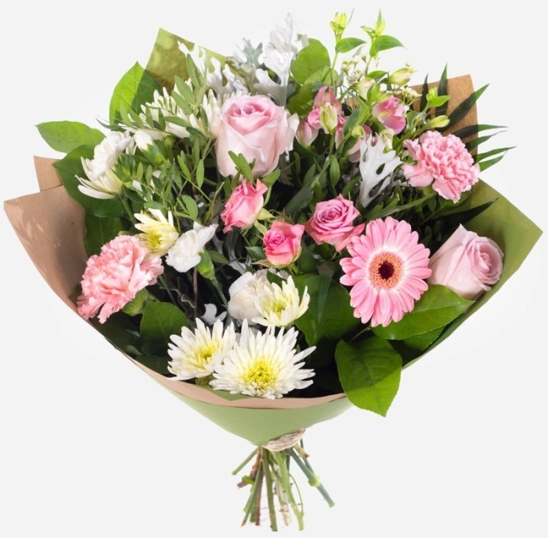 Soft, elegant, and beautifully balanced — Pink Perfection is a graceful blend of pink and white tones complemented by fresh greenery. Delicate yet full of life, this hand-tied design brings a gentle touch of beauty and charm to any setting.