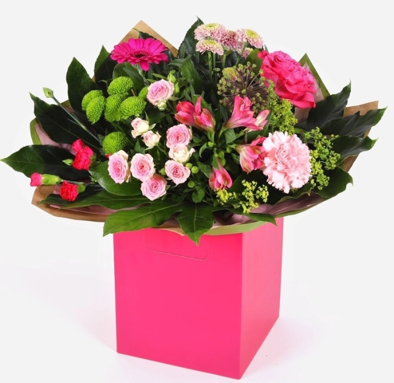 A stunning arrangement of pink and green seasonal blooms, styled in a vibrant pink box. Designed to brighten spaces and spirits alike.