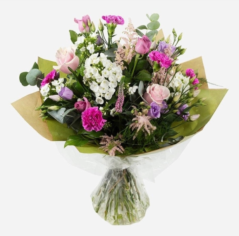 A water bubble bursting with fresh, seasonal blooms in dreamy pinks and purples. Simply unwrap, display, and enjoy.